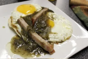 - Slide egg onto Tostada and top with tomatillo and ham mixture — Serve immediately